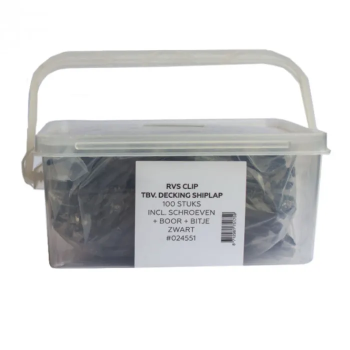 Montageclip tbv C-Wood Shiplap plank, rvs zwarte clip met schroeven 100 stuks. Inclusief boor en bitje. Voor de montage van de 14,5 cm plank. Je kan met 1 emmer van 100 stuks circa 5 m2 vlonderplanken monteren van 14 tot 15 cm breedte.