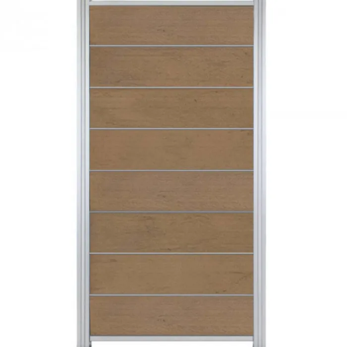 C-Wood zelfbouw schutting composiet Modular bruin gevlamd met blank aluminium accessoires. Geschikt om een scherm te maken van 180 cm hoog en maximaal 90 cm breed. De onderdelen dien je in de breedte in te korten om tot 90 cm breed te komen.
