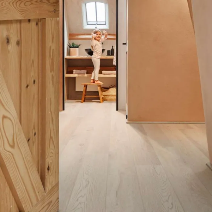 Eerst een duurzame geïntegreerde kurkonderlaag met daarop een akoestische geluiddempende laag. Vervolgens de comfort- en stijlvolle laag die niet te onderscheiden zijn van echt hout en tot slot een hoogwaardige slijtlaag van 0.55 mm dik.