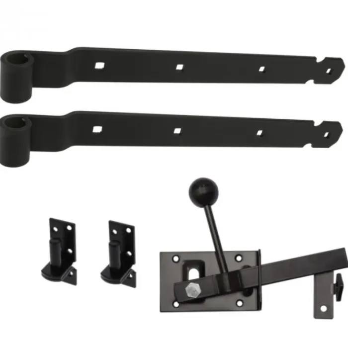 Beslag tbv houten tuinpoorten zwart gepoedercoat. Set bestaat uit een heksluiting, 2 plaatduimen en 2 duimhengen. Wordt geleverd zonder schroeven.