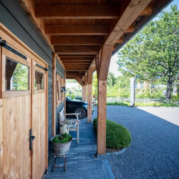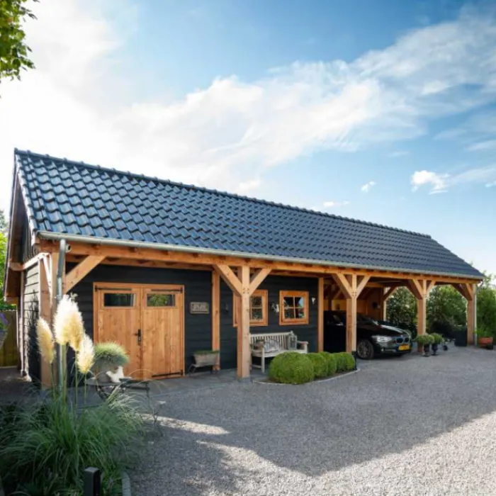 Trendhout Kapschuur De Hofstee XXL. Dit is het basis model van 6 meter diep en beschikbaar in diverse breedte maten. Wil je deze kapschuur helemaal naar eigen wens samen stellen klik dan op de knop hierboven en ontwerp je kapschuur in de 3D configurator.