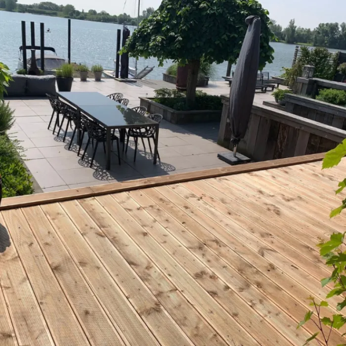 De vlonderplank is onbehandeld, kunstmatig gedroogd en geschaafd. Doordat de planken kunstmatig gedroogd zijn, zullen de planken veel minder werken en dus veel maatvaster zijn.