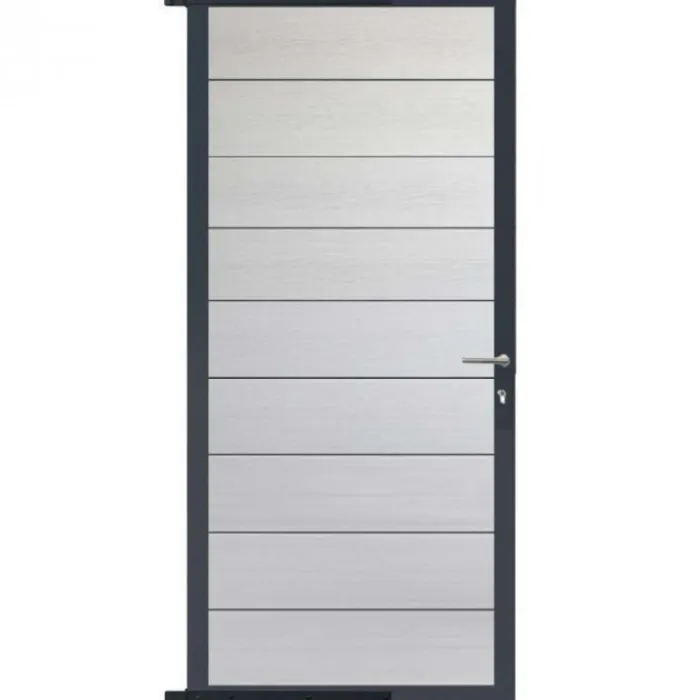 C-Wood zelfbouw tuindeur aluminium antraciet frame Modular – composiet wit. Afmeting 90 x 200 cm. De hoogte van de tuindeur is enkele centimeters lager dan de opgegeven 200 cm. De tuindeur wordt geleverd inclusief deurbeslag.