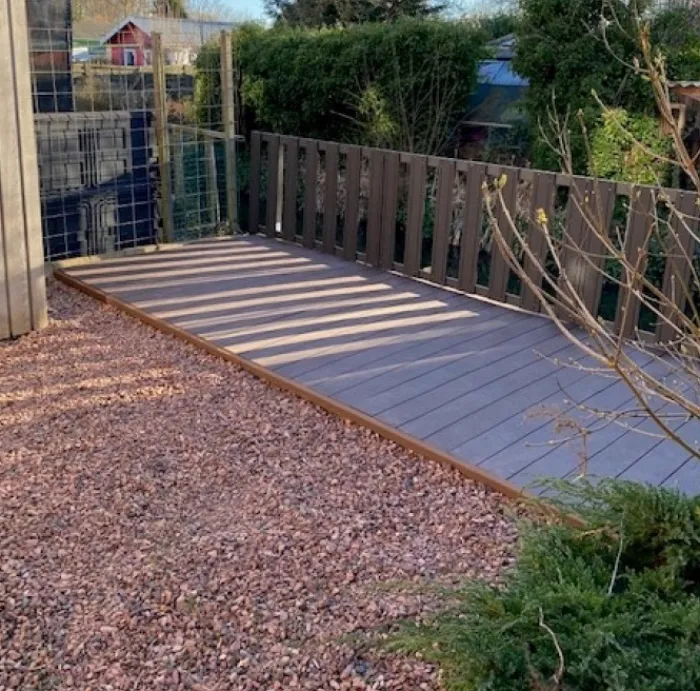 Vlonder totaalpakket voor 1,00 m2, gelegd met steengrijs composiet vlonderplanken van 300 cm lang, 2,1 cm hoog en 14,0 cm breed. Pakket bestaat uit vlonderplanken, onderbalken, clips en schroeven om een vlonderterras van te maken. De bijbehorende clips en de kop van de schroef zijn in dezelfde kleur. Vul het benodigd aantal vierkante meter terras in en de website rekent automatisch uit hoeveel planken je ontvangt.