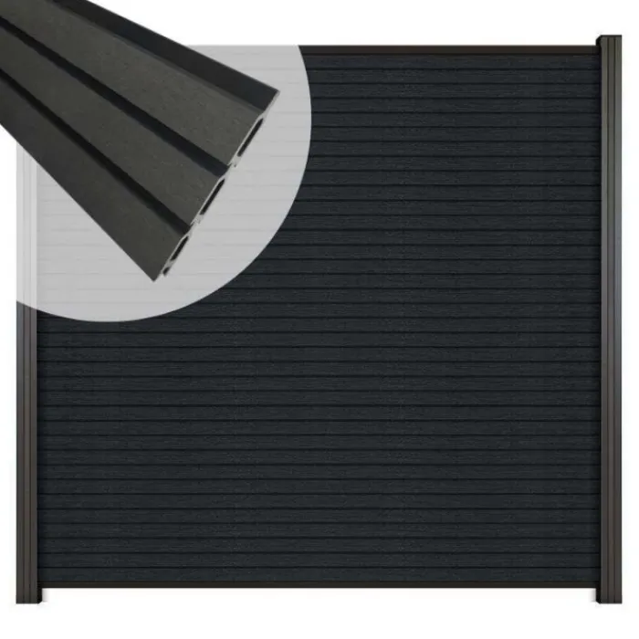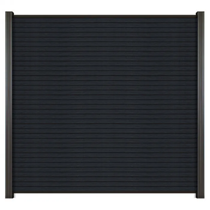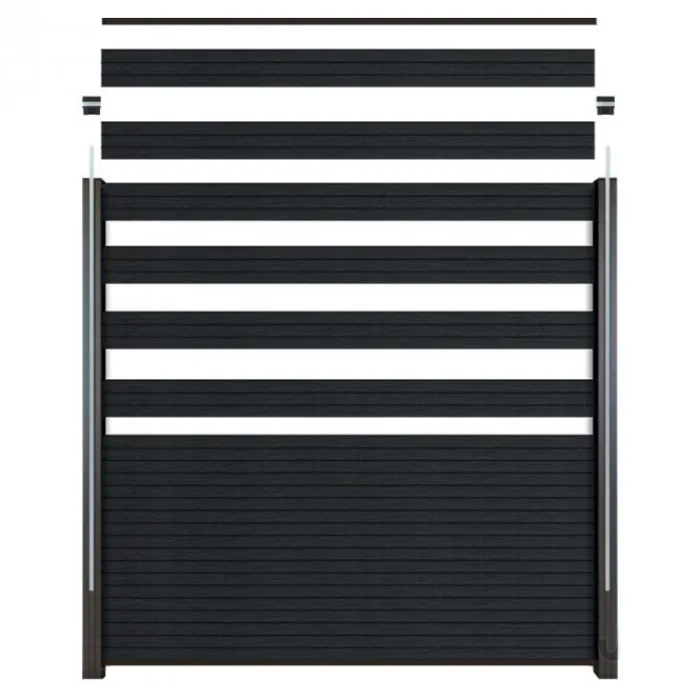 C-Wood zelfbouw schutting composiet Rhombus Triple antraciet met zwart aluminium accessoires. Geschikt om een scherm te maken van 180 cm hoog en maximaal 180 cm breed. De breedte is eenvoudig in te korten.