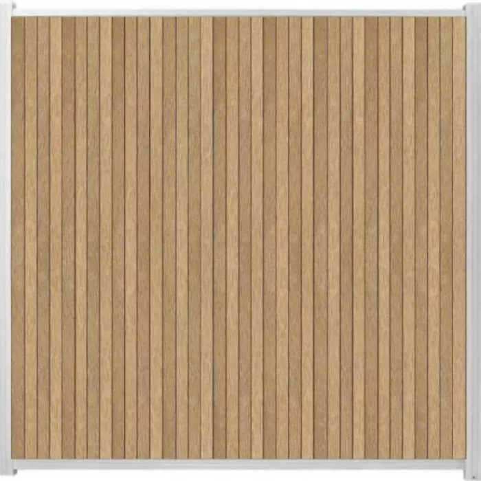 C-Wood zelfbouw schutting composiet Rhombus Triple teak met wit aluminium accesoires. Met deze bundel kun je een verticale schutting bouwen circa 170 cm breed en 180 cm hoog.