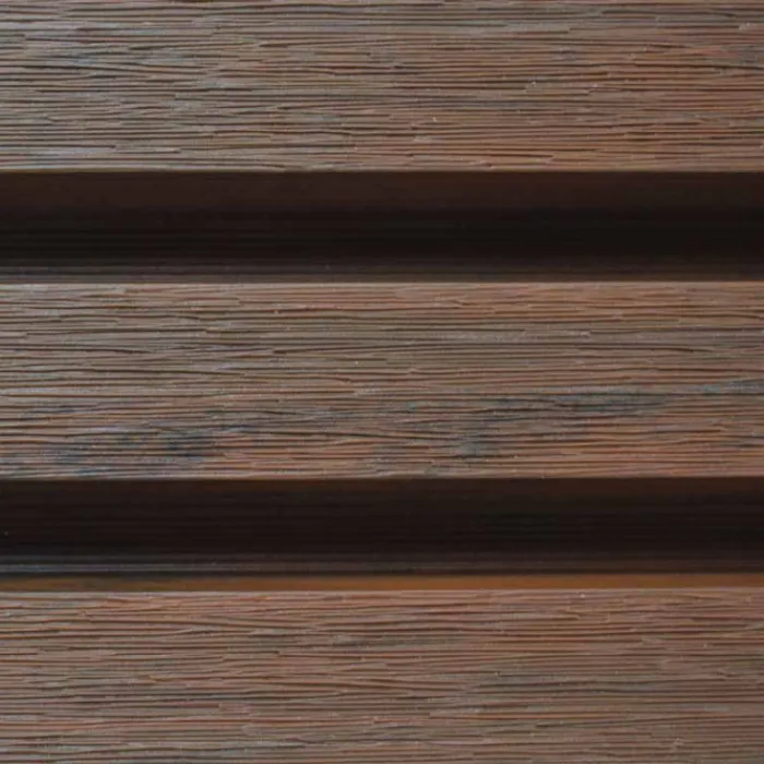 De plank heeft een natuurlijke houtuitstraling door de kleur en nagebootste houtstructuur. Het trapezevormige profiel geeft het geheel een moderne en strakke uitstraling.