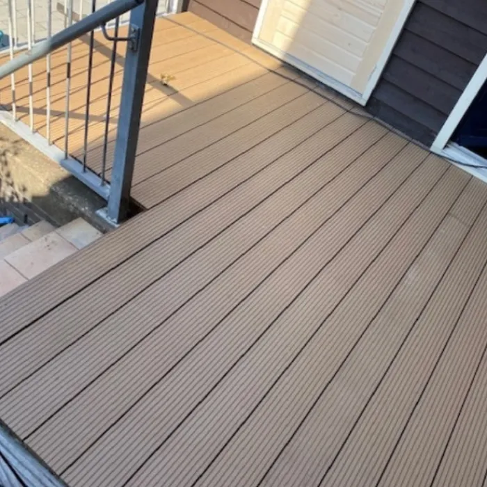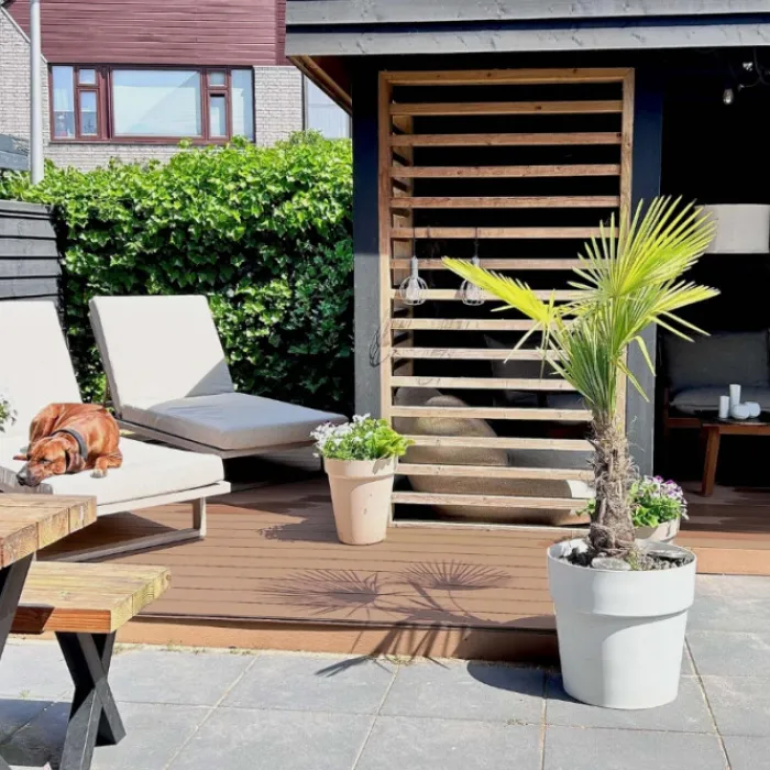 Vlonder totaalpakket voor 1,00 m2, gelegd met teak bruin composiet vlonderplanken van 400 cm lang, 2,1 cm hoog en 14,0 cm breed. Pakket bestaat uit vlonderplanken, onderbalken, clips en schroeven om een vlonderterras van te maken. Vul het benodigd aantal vierkante meter terras in en de website rekent automatisch uit hoeveel planken je ontvangt.