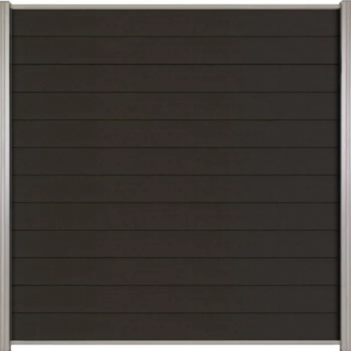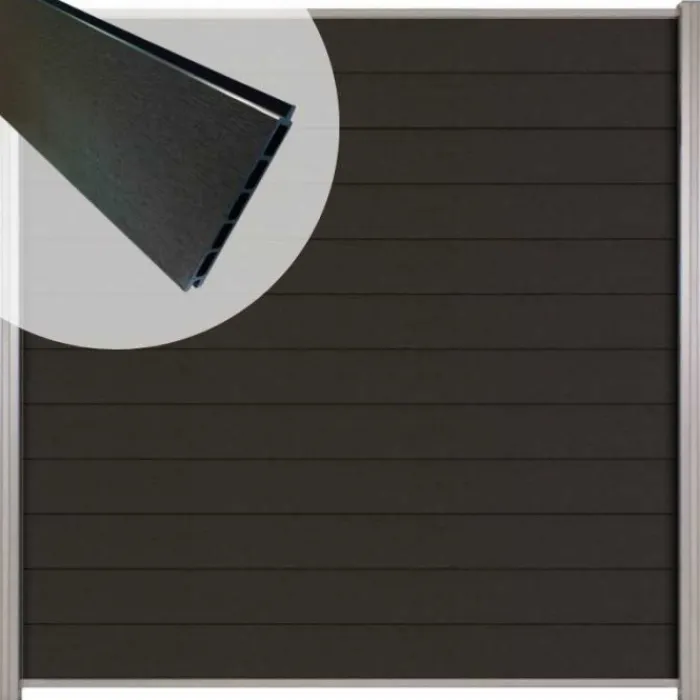 C-Wood zelfbouw schutting composiet Mix & Match antraciet met blank aluminium accessoires. Afmeting is 180 x 180 cm. De schuttingdelen schuif je van bovenaf tussen de C-Wood Modular / Mix & Match palen. De volgorde van de verschillende planken kan je zelf bepalen. Je begint onder en eindigt bovenop. De netto hoogte van deze schutting is enkele centimeters lager dan de opgegeven 180 cm.