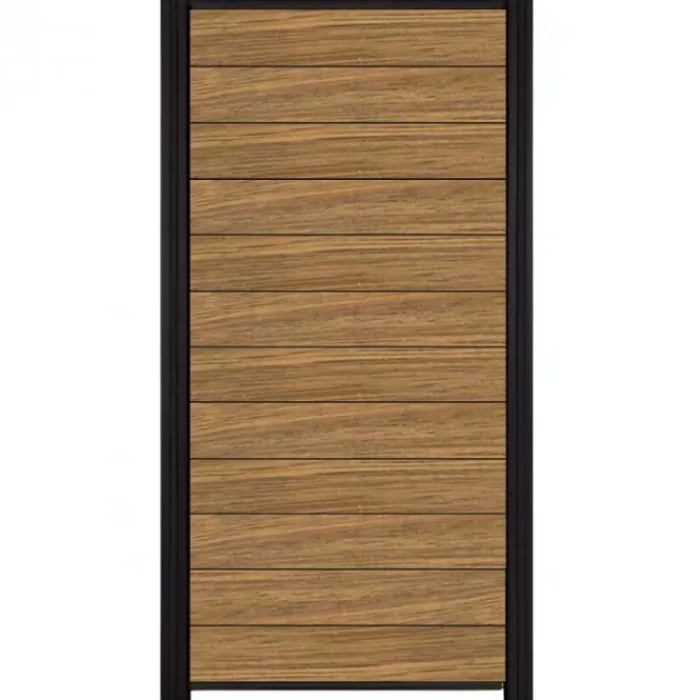 C-Wood zelfbouw schutting hardhout Mix & Match Thermo Fraké met zwart aluminium accessoires. Afmeting is 90 x 180 cm. De schuttingdelen schuif je van bovenaf tussen de C-Wood Modular / Mix & Match palen. De volgorde van de verschillende planken kan je zelf bepalen. Je begint onder en eindigt bovenop. De netto hoogte van deze schutting is enkele centimeters lager dan de opgegeven 180 cm. De onderdelen dien je in de breedte in te korten om tot 90 cm breed te komen.