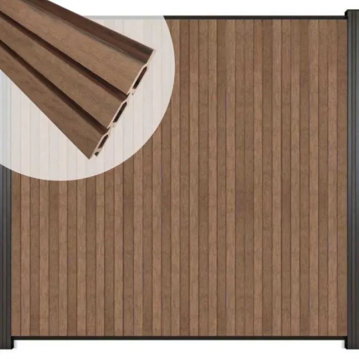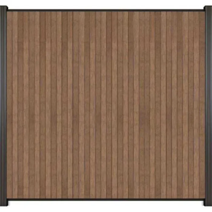 C-Wood zelfbouw schutting composiet Rhombus Triple bruin gevlamd met antraciet aluminium accesoires. Met deze bundel kun je een verticale schutting bouwen circa 170 cm breed en 180 cm hoog.