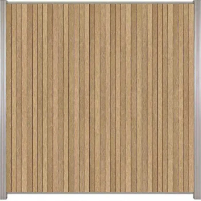 C-Wood zelfbouw schutting composiet Rhombus Triple teak met blank aluminium accesoires. Met deze bundel kun je een verticale schutting bouwen circa 170 cm breed en 180 cm hoog.