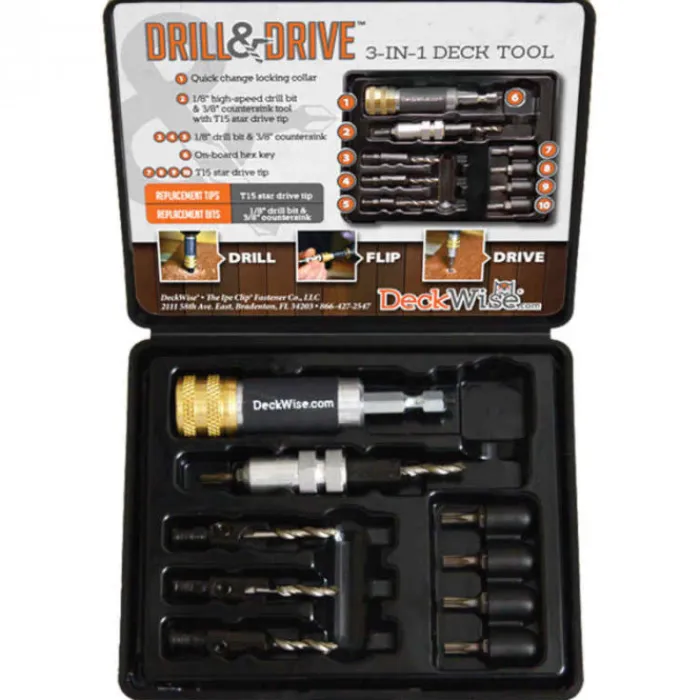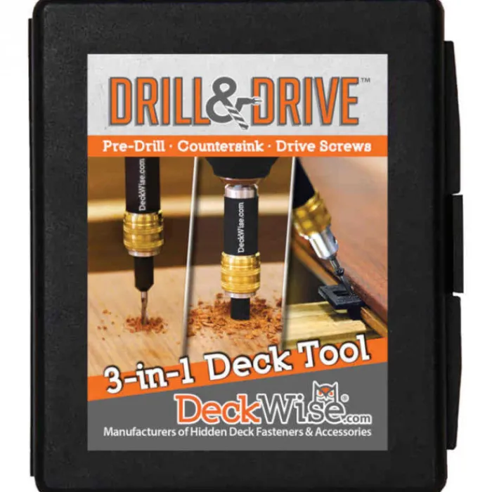 Deckwise 3-in-1 vlonder gereedschap. Voor het in één stap verzinken van kopschroeven of voor het boren van pluggaten met geleidingsgaten.