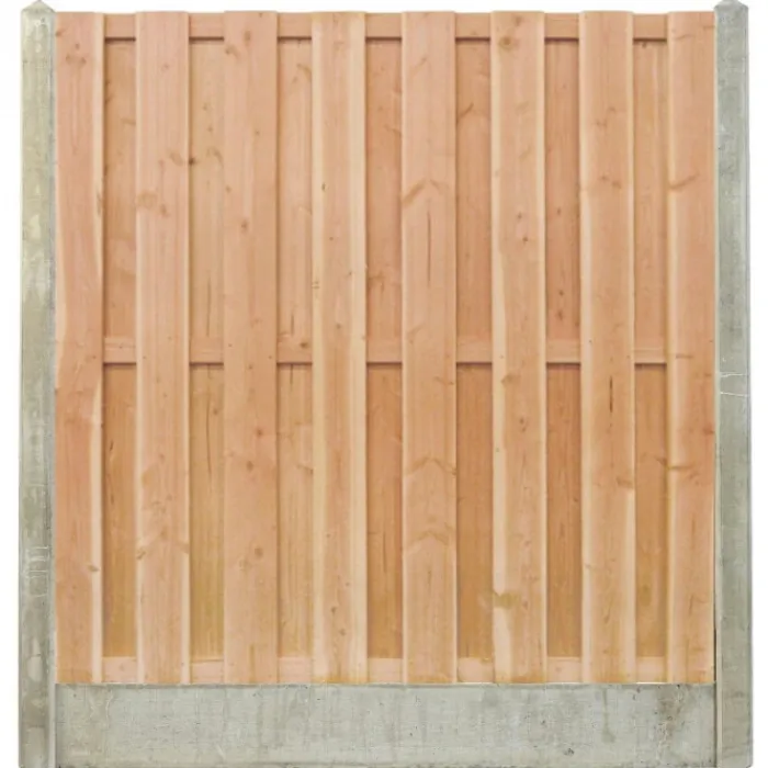 Uitvoering: Douglashout (Douglas hout) schutting 180 x 180 gecombineerd met grijze betonpalen en een grijze latei. Hierdoor kom je uit op 197 x 200 cm.