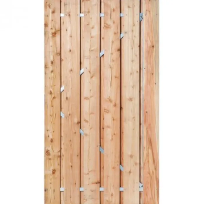 HomingXL Tuindeur met ijzeren frame 195 cm hoog, tenzij anders vermeld, en in diverse breedtes leverbaar. Het frame is voorzien van douglas, geschaafde planken. De planken zijn 14 cm breed, 1,6 cm dik en de totale hoogte is 195 cm. Je kunt de hoogte inkorten door de planken af te zagen.