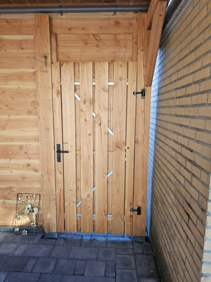 HomingXL Tuindeur met ijzeren frame 90 x 195 cm inclusief zwart beslag. Het frame is voorzien van Douglas, geschaafde planken. De planken zijn 14 cm breed, 1,6 cm dik en de totale hoogte is 195 cm. Je kunt de hoogte inkorten door de planken af te zagen.