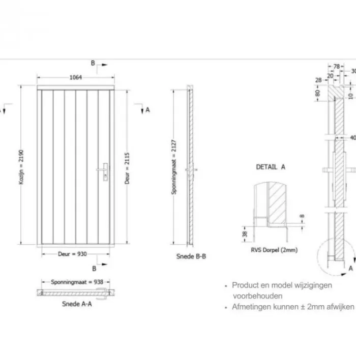 Trendhout enkele plaatdeur inclusief kozijn. Afmeting deur – 930 x 2115 mm. Afmeting kozijn – 1064 x 2189 mm. Door de aluminium inlage heeft deze plaatdeur een hoge stabiliteit en maatvastheid. De plaatdeur wordt geleverd exclusief dorpel. Deze is te vinden bij de bijbehorende producten.