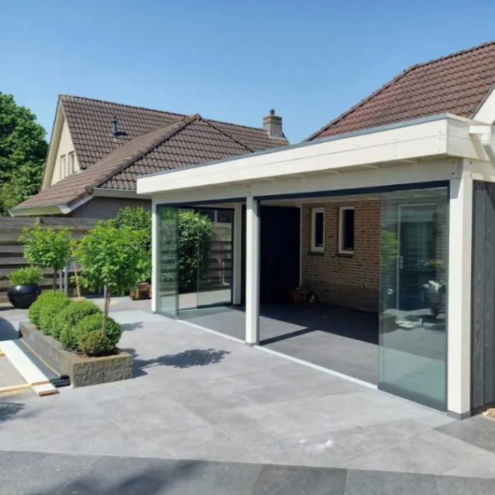 Deze veranda is als bouwpakket samengesteld en het laten opbouwen door Trendhout is mogelijk. Neem contact met ons op voor de mogelijkheden.
