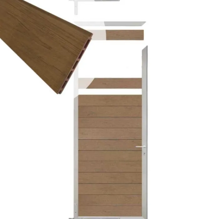 C-Wood zelfbouw tuinpoort Mix & Match blank aluminium frame met composiet bruin gevlamd lamellen. Afmeting 90 x 200 cm. De netto hoogte van deze tuinpoort is enkele centimeters lager dan de opgegeven 200 cm. De poort wordt geleverd inclusief deurbeslag.