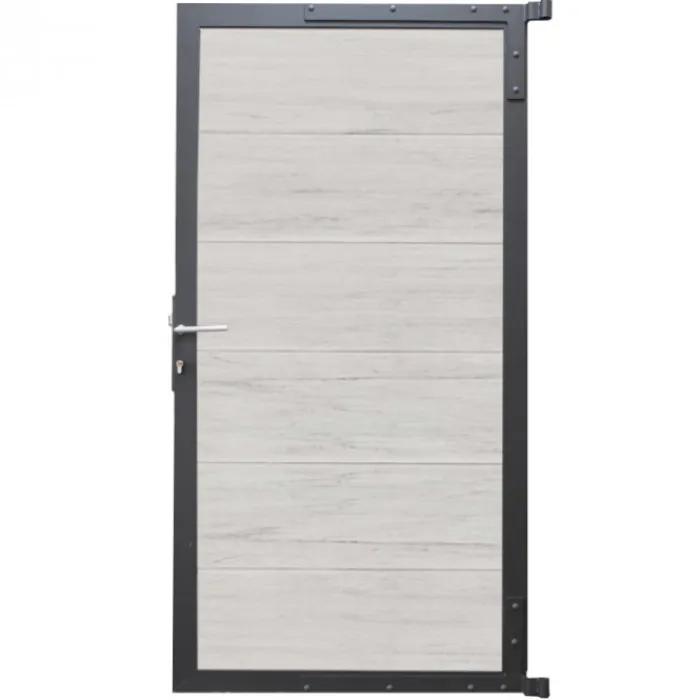 C-Wood tuindeur composiet Mix & Match frame aluminium antraciet gepoedercoat (90 x 180 cm). De netto hoogte van deze tuindeur is enkele centimeters lager dan de opgegeven 180 cm. Deze komt uit op 175 cm hoog. De deur wordt geleverd inclusief deurbeslag.