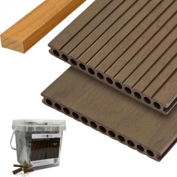 Vlonder totaalpakket voor 1,00 m2, gelegd met XXL bruin gevlamd composiet vlonderplanken van 400 cm lang, 2,5 cm hoog en 14,0 cm breed. Pakket bestaat uit vlonderplanken, onderbalken, clips en schroeven om een vlonderterras van te maken. De bijbehorende clips en de kop van de schroef zijn in dezelfde kleur. Vul het benodigd aantal vierkante meter terras in en de website rekent automatisch uit hoeveel planken je ontvangt.