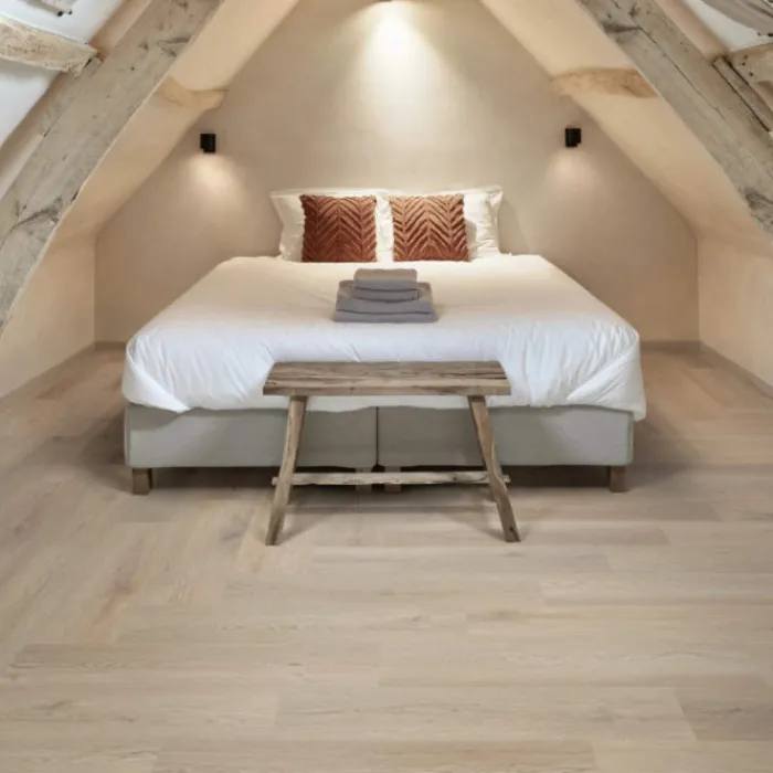 Eerst een duurzame geïntegreerde kurkonderlaag met daarop een akoestische geluiddempende laag. Vervolgens de comfort- en stijlvolle laag die niet te onderscheiden zijn van echt hout en tot slot een hoogwaardige slijtlaag van 0.55 mm dik.