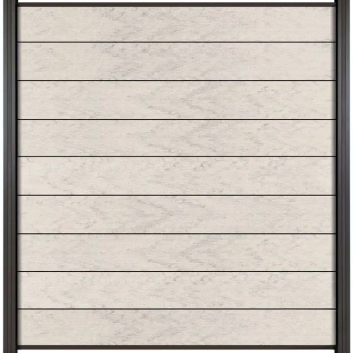 Modulaire schutting composiet bicolor betongrijs met antraciet aluminium liggers. De totale afmeting is 180 x 200 cm.