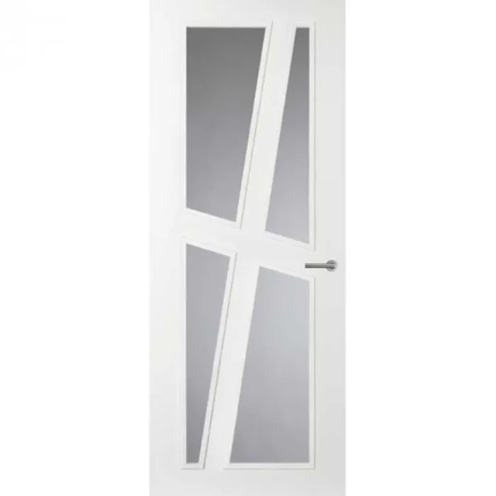 Origineel en opvallend design. Deur met rechthoekig ruitvlak, dat door diagonale, brede stijlen is onderverdeeld in vier asymmetrische ruitvlakken.