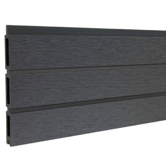 Elephant lamellen set composiet triple Rhombus rock grey. Afmeting 180 x 15 cm, verpakt per 6 stuks. Werkende hoogte is 14,1 cm. De dikte van de lamellen is 2 cm.