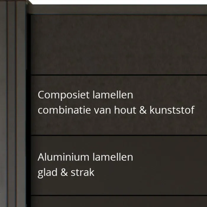 Deze set bestaat uit 10 composiet dark grey lamellen en 2 aluminium antraciet lamellen. Je begint onder en je eindigt bovenop altijd met een aluminium antraciete profielen. exclusief palen! Gebruik hiervoor altijd de Elephant Modular/Mix&Match sleufpalen.