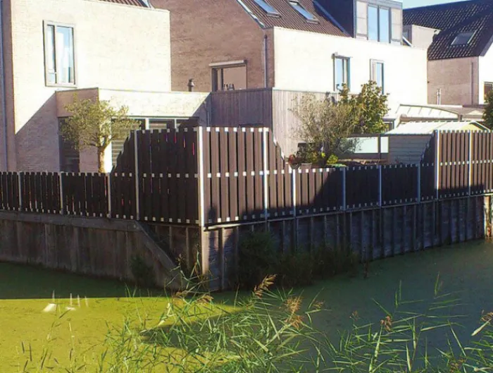 Schuin Design composiet tuinscherm van 90 cm breed. Te combineren met lage schermen van 93 cm hoog en de 180 cm hoge tuinschermen. Bestaat uit aluminium liggers en composiet planken.