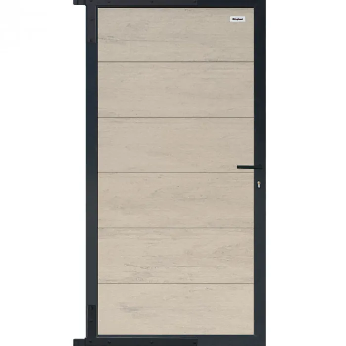 Tuindeur composiet Forte betongrijs met hang- en sluitwerk, slot en antraciet aluminium kader (90 x 180 cm). Afhankelijk van hoe je het hang- & sluitwerk monteert is deze deur links- of rechtsdraaiend.