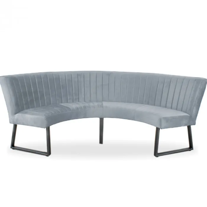 HomingXL ronde eetkamerbank geschikt voor een ronde tafel met een diameter van 150 cm. Deze stoere halfronde eetkamerbank Hengelo is gestoffeerd met de prachtige Element velours stof in de kleur lichtblauw. De bank is uitgevoerd met zwarte metalen poten. Deze eetkamerbank heeft een stoere uitstraling en is zowel geschikt voor een industrieel als een modern interieur.
