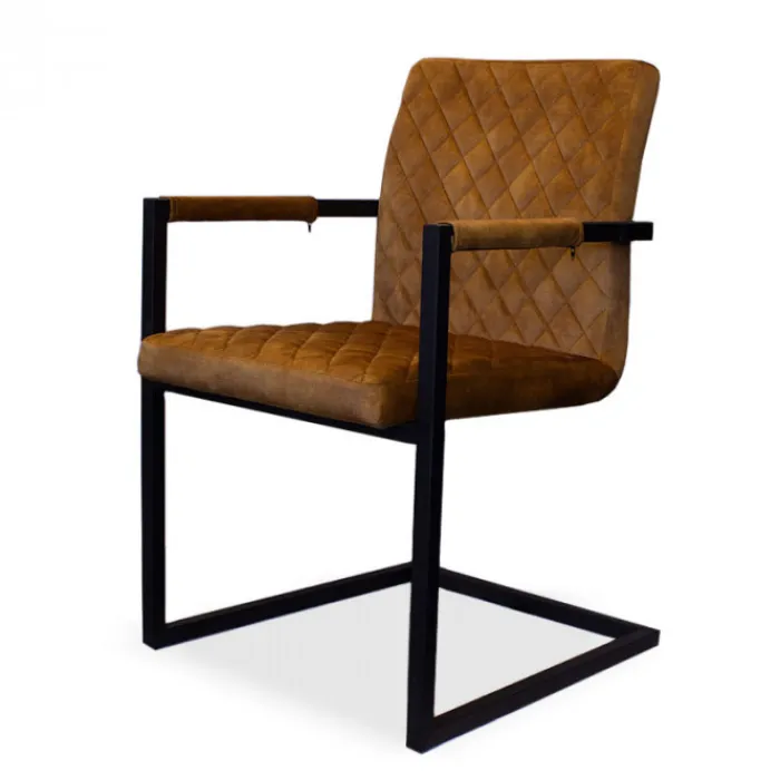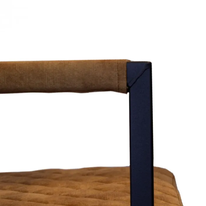 De eetkamerstoel Rome is een stoere, industriële eetkamerstoel bekleedt met een prachtige stof Adore in de kleur goud. De Het “zwevende” model geeft de stoel niet alleen een mooie look, maar zorgt er ook nog eens voor dat de stoel heerlijk comfortabel zit! Zo kun je urenlang heerlijk tafelen…! De Rome is uitgevoerd met zwarte metalen poten. Deze stoel heeft decoratieve stiksels op de rugleuning.