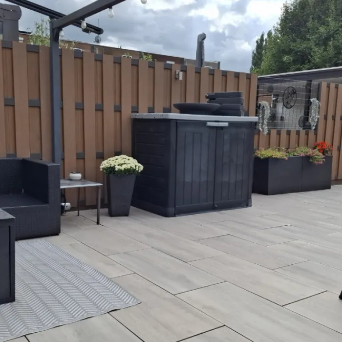 Tuinscherm Bari bruin gevlamd met antraciet aluminium frame. Hoogte 180 cm x Breedte 180 cm. Schermdikte 2,9 cm. Dit scherm is voorzien van 4 aluminium liggers en hiervoor heb je per scherm 8 x het T-beslag nodig om deze aan een paal te bevestigen.