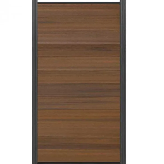 Schutting composiet co-extrusie Garda teak met antraciet aluminium kader (90 x 180 cm). Deze schutting wordt geleverd als een zelfbouw pakket waarmee je zelf een unieke schutting kunt maken.