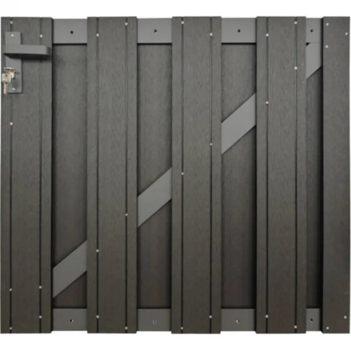 C-Wood compleet tuinhek set met poort antraciet composiet Stijl met antraciet aluminium frame. Stevig en zeer onderhoudsvriendelijk tuinhek gemaakt van antraciet aluminium dwarsliggers met daartussen 14 composietplanken in de kleur antraciet. De tuinhekken zijn eenvoudig in de breedte in te korten door een of meerdere kunststof lamellen eraf te schroeven. De aluminium liggers kun je inkorten met een ijzerzaag.