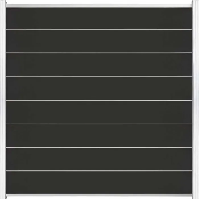 C-Wood zelfbouw schutting composiet Modular antraciet met wit aluminium accessoires. Geschikt om een scherm te maken van 180 cm hoog en maximaal 180 cm breed. De breedte is eenvoudig in te korten. De netto hoogte van het scherm is enkele centimeters lager dan de opgegeven 180 cm.