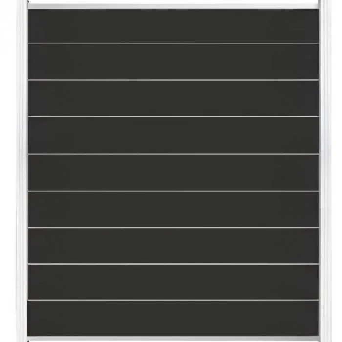 C-Wood zelfbouw schutting composiet Modular antraciet met wit aluminium accessoires. Geschikt om een scherm te maken van 200 cm hoog en maximaal 180 cm breed. De breedte is eenvoudig in te korten. De netto hoogte van het scherm is enkele centimeters lager dan de opgegeven 200 cm.