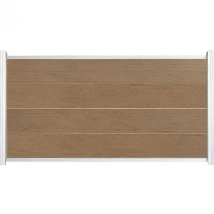 C-Wood zelfbouw schutting composiet Modular bruin gevlamd met wit aluminium accessoires. Geschikt om een scherm te maken van 97 cm hoog en maximaal 180 cm breed. De breedte is eenvoudig in te korten.