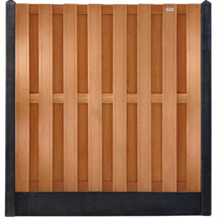 Hout & Beton schutting zwart | hardhout Bankirai Timber recht 15L (180 x 180 cm) v-groef schermdikte 3,9 cm. Gecombineerd met zwarte betonpalen en een zwarte latei. Hierdoor kom je uit op 197 x 200 cm.