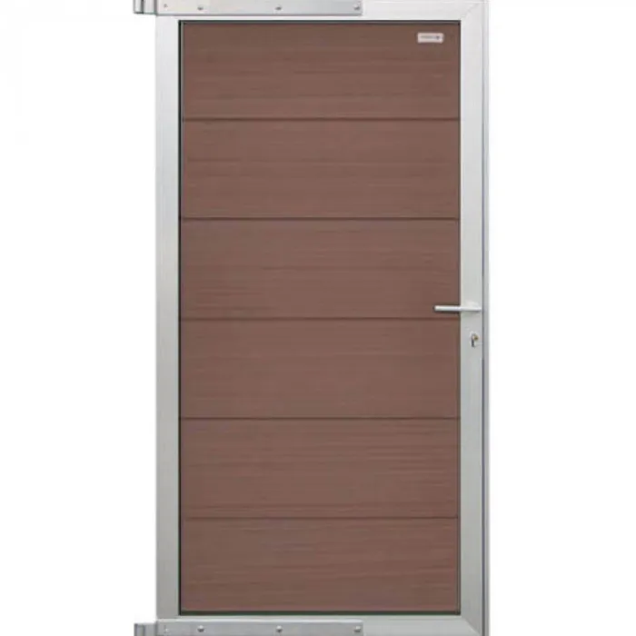 Tuindeur composiet Forte, bijpassend aan Forte tuinschermen Bruin met aluminium kader. Inclusief hang- en sluitwerk, slot en sleutels. Afhankelijk van hoe je het hang- & sluitwerk monteert is deze deur links- of rechtsdraaiend.