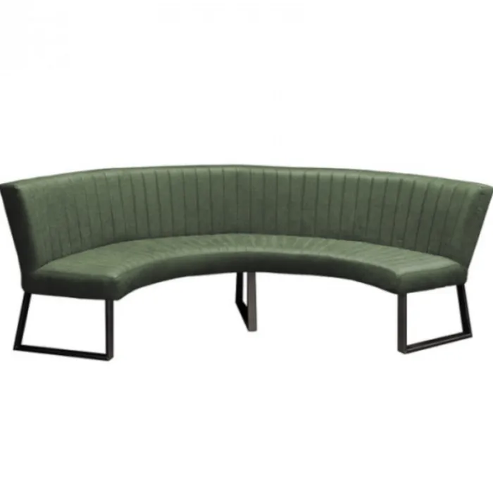 HomingXL ronde eetkamerbank geschikt voor een ronde tafel met een diameter van 150 cm. Deze stoere halfronde eetkamerbank Hengelo is gestoffeerd met de prachtige groen-kleurige lederlook stof Missouri 10. De bank is uitgevoerd met zwarte metalen poten. Deze eetkamerbank heeft een stoere uitstraling en is zowel geschikt voor een industrieel als een modern interieur.