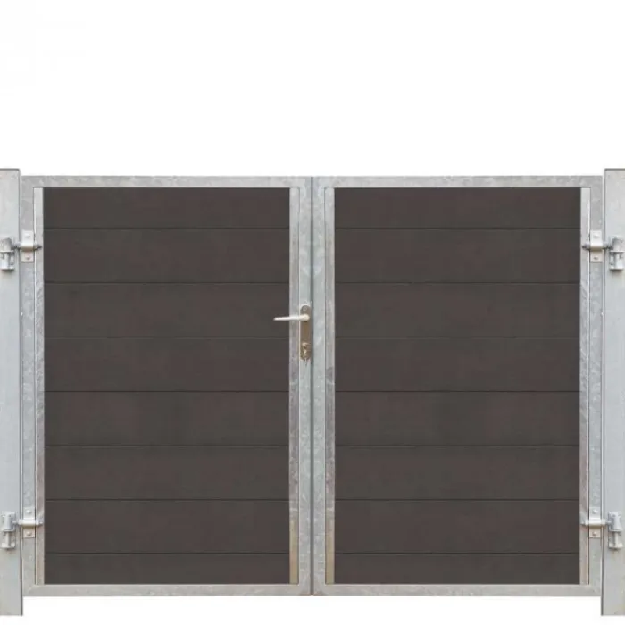 De antraciet kleurige dubbele tuindeur met stalen frame heeft lamellen gemaakt van composiet. De dubbele tuindeur is makkelijk schoon te maken. Het frame is gemaakt van thermisch verzinkt staal. De dubbele tuindeur heeft een afmeting van 99 x 180 cm. De palen worden meegeleverd. Hierdoor komt je uit op een afmeting van 213 x 180 cm (2x 16 cm palen). De deur gaat naar links open.