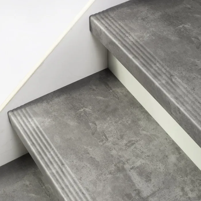 Dit is een complete Stepwoord traprenovatieset met SPC toplaag traptreden en stootborden in de kleur beton grijs, inclusief montagekit en afwerkingskit. Deze complete set is geschikt voor een trap met 2 kwart draai met 12 treden. De set wordt geleverd inclusief stootborden, omdat het een set voor een dichte trap betreft.