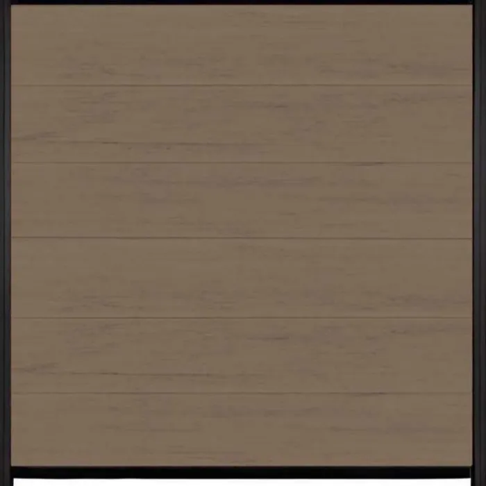 Schutting composiet co-extrusie Como vergrijsd bruin met zwart aluminium kader (180 x 180 cm). Deze schutting wordt geleverd als een zelfbouw pakket waarmee je zelf een unieke schutting kunt maken.
