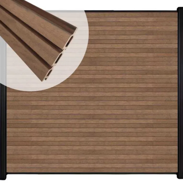 C-Wood zelfbouw schutting composiet Rhombus Triple bruin gevlamd met zwart aluminium accessoires. Geschikt om een scherm te maken van 180 cm hoog en maximaal 180 cm breed. De breedte is eenvoudig in te korten.