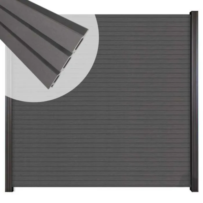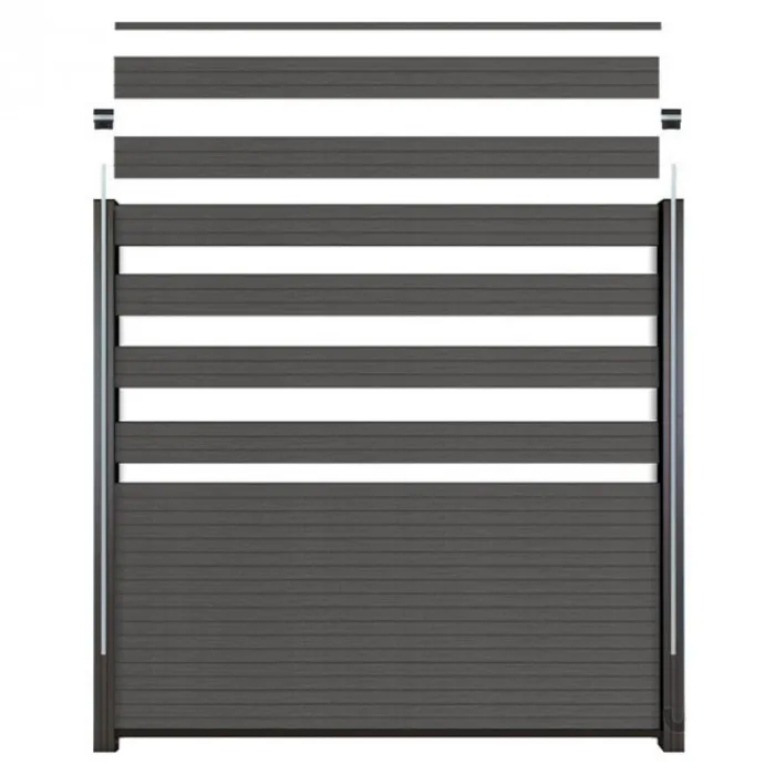 C-Wood zelfbouw schutting composiet Rhombus Triple rock grey met zwart aluminium accessoires. Geschikt om een scherm te maken van 180 cm hoog en maximaal 180 cm breed. De breedte is eenvoudig in te korten.