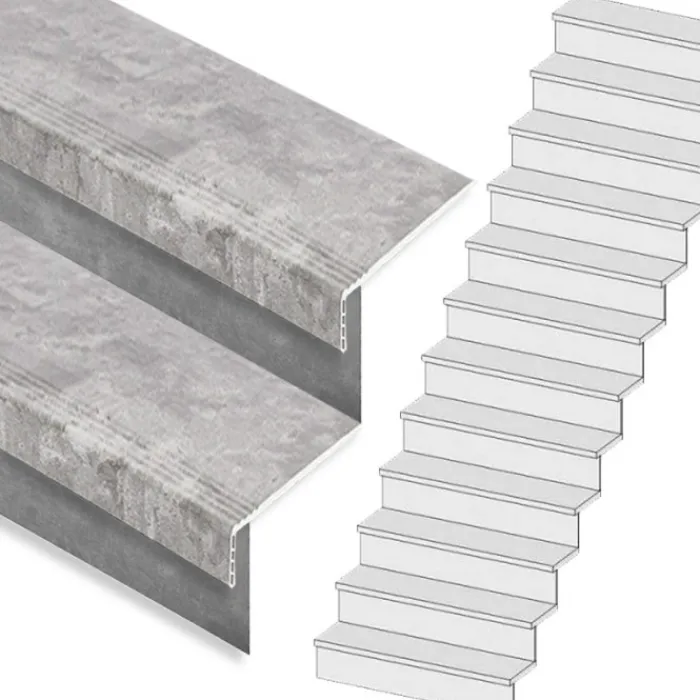 Dit is een complete Stepwoord traprenovatieset met SPC toplaag traptreden en stootborden in de kleur beton grijs, inclusief montagekit en afwerkingskit. Deze complete set is geschikt voor een rechte trap met 13 treden. De set wordt geleverd inclusief stootborden, omdat het een set voor een dichte trap betreft.
