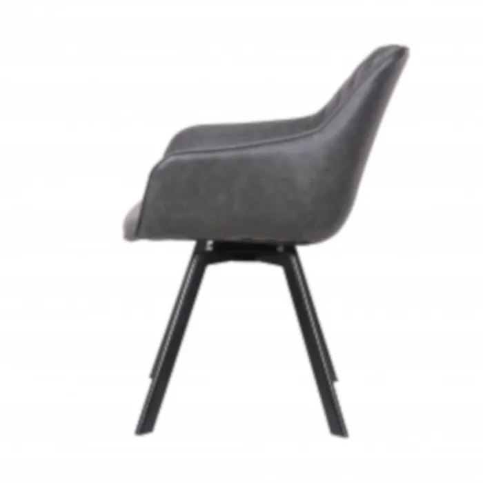 Bo Lundgren eetkamerstoel model Ringo. Lederlook antraciet. Deze stoel is 180 graden draaibaar en komt vanzelf weer terug in de originele stand. De stoel is bekleed met een lederlook stof. Dit is een duurzaam en kunststof alternatief voor echt leer. Het kuipvormige model kan 180 graden draaien en zorgt ervoor dat de stoel heerlijk comfortabel zit! De stoel Ringo heeft een hoge rugleuning, zo kun je urenlang heerlijk tafelen…! Deze is uitgevoerd met zwarte metalen poten.